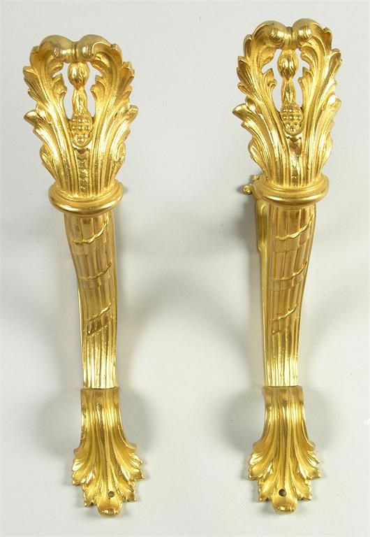 A set of four gilt brass curtain pole brackets, 12in (30.4cm) h, 8.5in (21.5cm) d. (4)