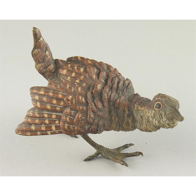 An Austrian cold painted bronze model of a Snipe by Bergman, stamped 'B within a vase', early 20th century, 4.75in (12cm) h, 6in (15cm) l.