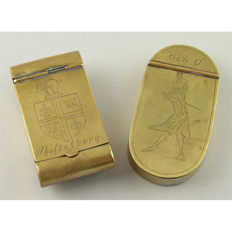 An oblong brass snuff box, engraved "Old Q", 4.25 x 2.25in (10.8 x 5.7cm) and a curved example engraved a coat of arms and 'Shaftesbury'. (2)