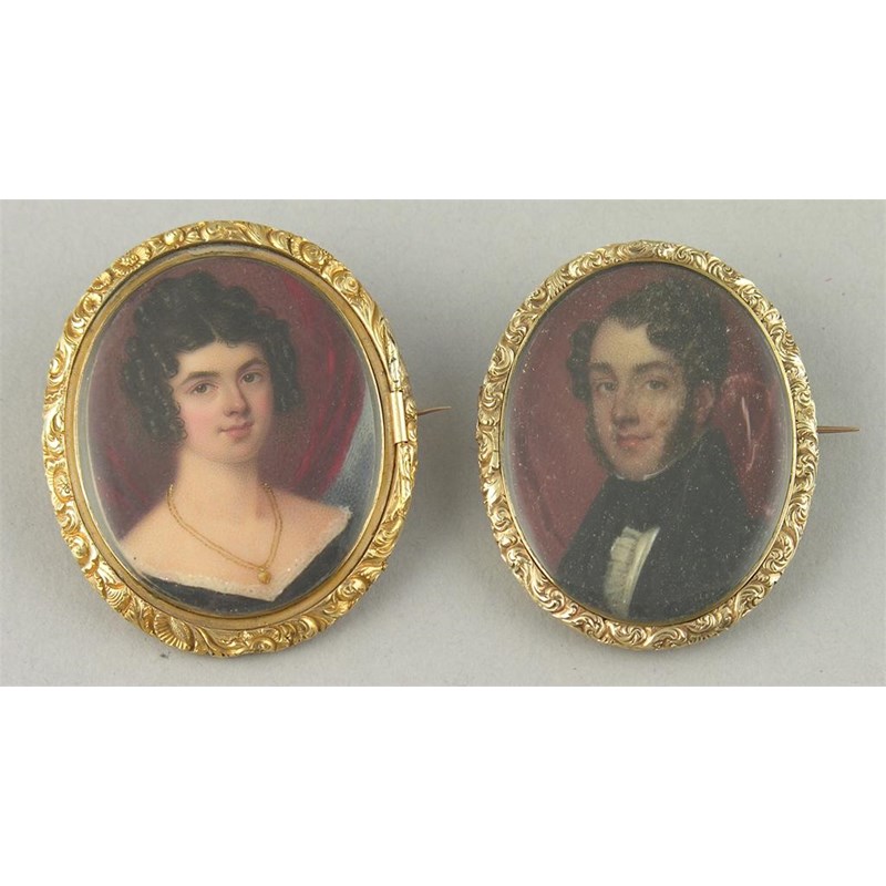 A pair of Victorian oval portrait miniatures, depicting a young lady and young man, mounted in gilt brooch frames, the versos with hair, in leather cases. (2)