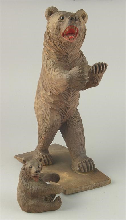A Black Forest carved wood standing bear, 12in (30.5cm) h, and a seated bear, 3.5in (9cm) h, previously holding a bottle. (2)