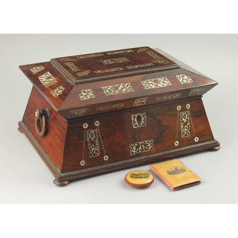 An early Victorian rosewood and mother-of-pearl inlaid sewing box, of sarcophagus shape, the interior with a pocket and a lift-out tray, 6.75in (17cm) h, 14in (35.5cm) w, 10.5in (26.5cm) d. The right ring handle missing.