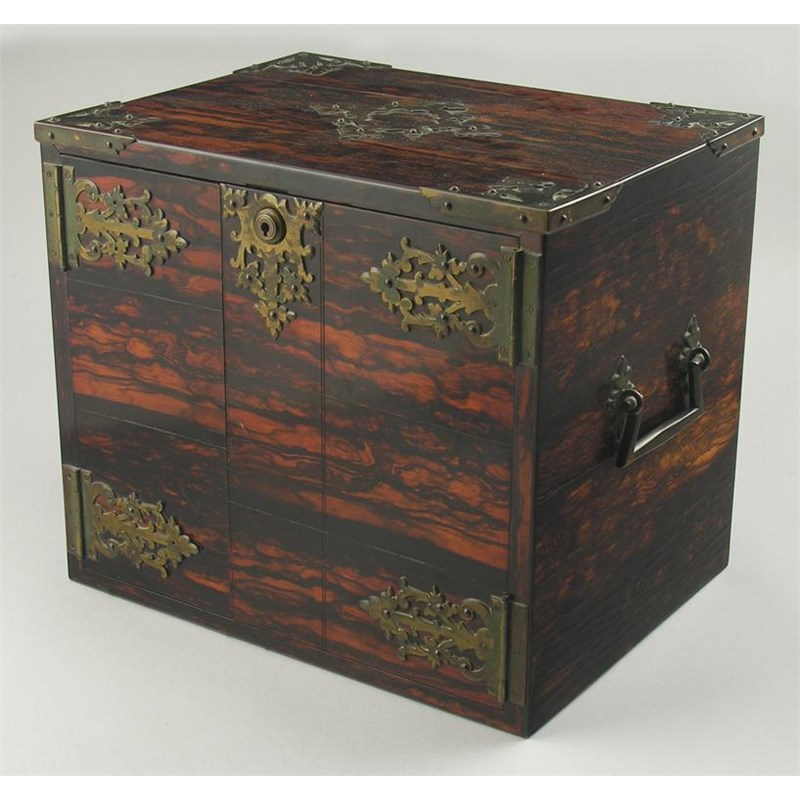 A Victorian coromandel and brass mounted cigar table cabinet, having two divided drawers enclosed by a pair of doors, the brass lock stamped 'Bramah, London', 11in (28cm) h, 12.75in (32.4cm) w, 9.5in (24cm) d.