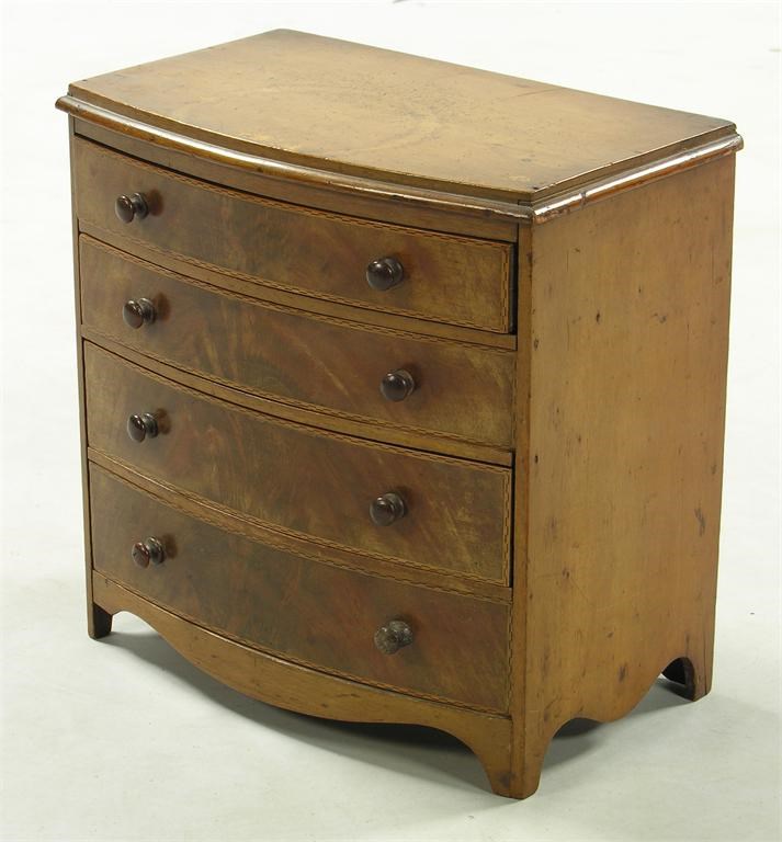 A Victorian mahogany miniature bowfront chest, the four long drawers with chequer stringing, 11.25in (28.5cm) h, 11.25in (28.5cm) w, 7in (17.5cm) d.
