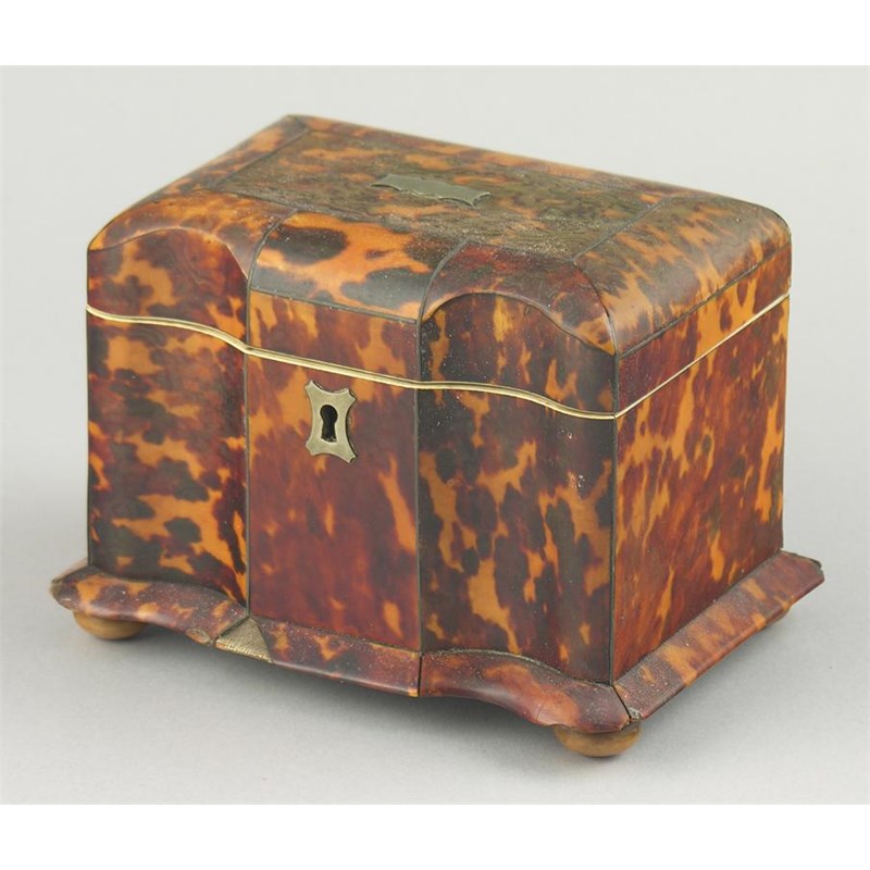 A Regency tortoiseshell tea caddy, inlaid pewter stringing with ivory edges, the arc d'arbelet front to a divided interior with a single cover, on turned vegetable ivory feet, 4in (10.2cm) h, 5.75in (14.6cm) w, 4.25in (10.7cm) d.
