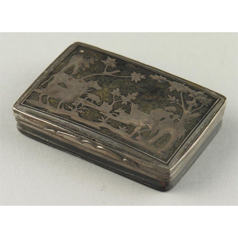 An early 18th century tortoiseshell and niello box, the hinged cover decorated a herdsman playing a flute, 3in (7.6cm) w.