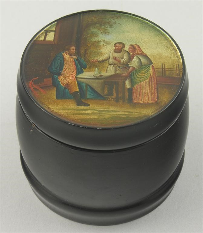 A 19th century Russian lacquer papier mache barrel shape tea caddy, the lid decorated figures around a table, 3.75in (9.5cm) h, 4in (10cm) dia. Provenence - The George Lowe Collection.