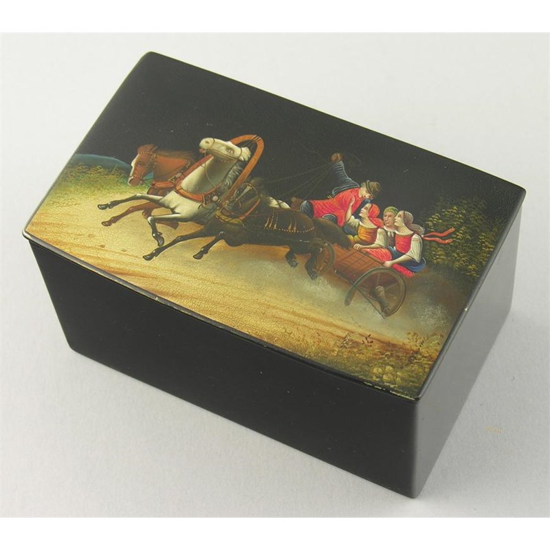 A late 19th century Russian lacquer papier mache rectangular tea caddy, the hinged lid painted a Troika with passengers, the interior with blue stamps, 3in (7.6cm) h, 5.5in (14cm) w. Provenence - The George Lowe Collection.
