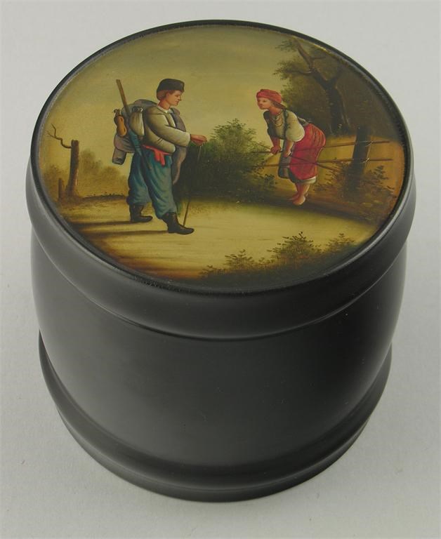 A late 19th century Russian lacquer papier mache tea caddy, the lid painted figures by a fence, the inside with gilt and silver stamps by V.O. Vishnyakov, dated 1882,1885, 4.75in (12cm) h, 5in (12.6cm) dia. Provenence - The George Lowe Collection.