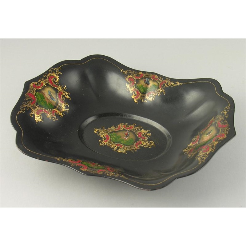 A 19th century French tole dish, the gilt and red vignettes decorated butterflies and a bird of paradise, 12.75 x 10in (32.4 x 25.4cm).