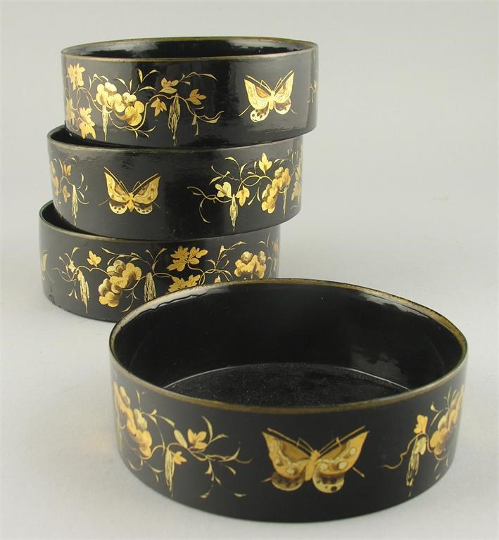 A set of four mid 19th century papier mache coasters, the black ground decorated gilt butterflies and foliage, 1.75in (4.5cm) h, 5.25in (13.3cm) h. (4)