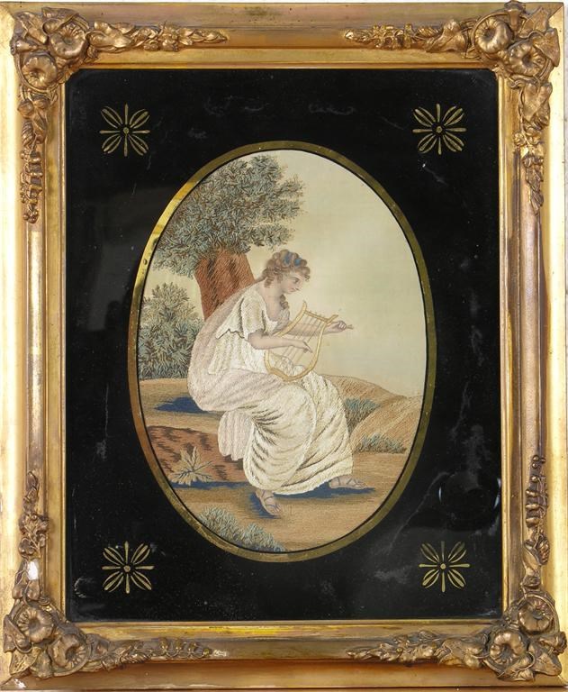 Four 19th Century oval silkwork pictures, depicting a lady playing the lyre, a shepherd, a country girl and a lady mourning at Shakespeare's tomb. 9 x 6.5in (23 x 16.5cm) with differing verre eglomise mounts (4).