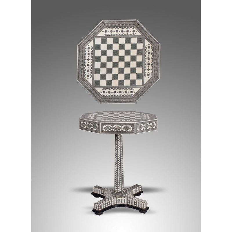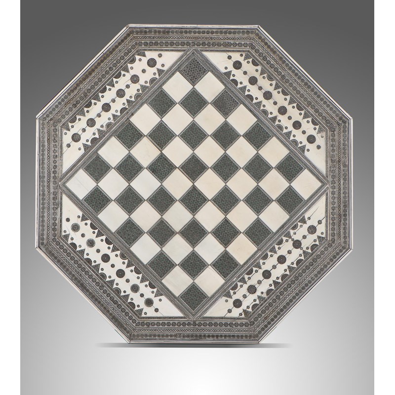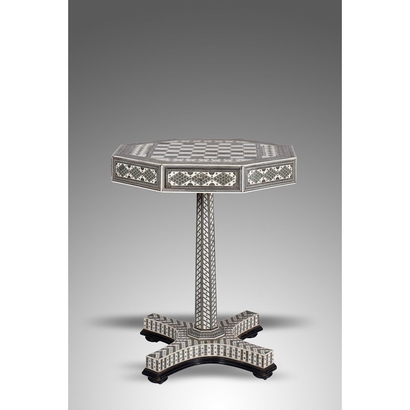λ A 19th century Anglo-Indian ivory and sadeli mosaic games table, inlaid with pewter and with green stained borders and panels, the octagonal top inlaid with bands of geometric decoration and with a chequer board, the frieze with four sandalwood drawers, two plush lined for chess / games pieces, one fitted with divisions for pens and ink with two glass wells and with a lined writing surface, the other fitted for sewing with five lidded compartments, thimble and reel holders and a pin cushion, on an octagonal tapering chevron decorated stem and conforming quatre-form base, with sunken brass castors, Western India, probably Bombay, 74.5cm high, 66.3cm wide.