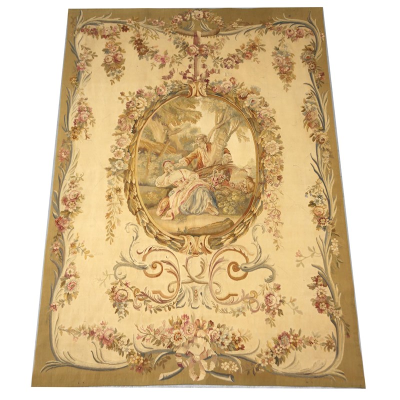A late 18th century French Aubusson tapestry after François Boucher, depicting a shepherd and shepherdess in an oval medallion, decorated with scrolls and garlands of flowers, 227 x 160cm.
