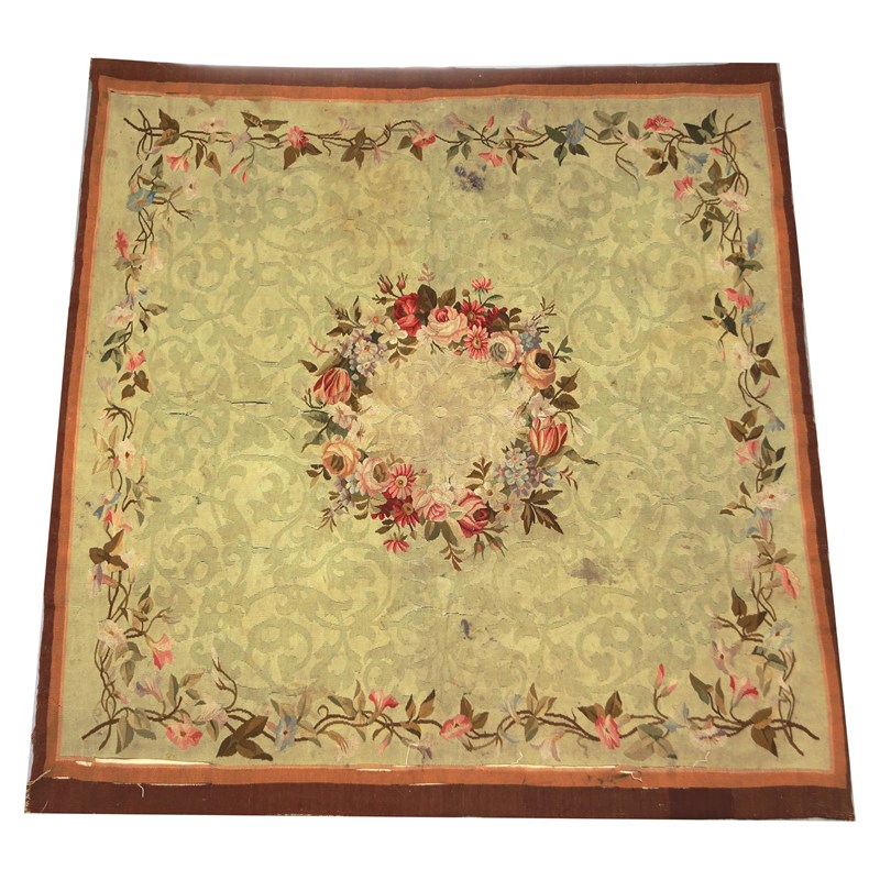 A 19th century French Aubusson tapestry rug, decorated with a floral wreath and borders, on a scrolling foliage ground, 171 x 160.5cm.