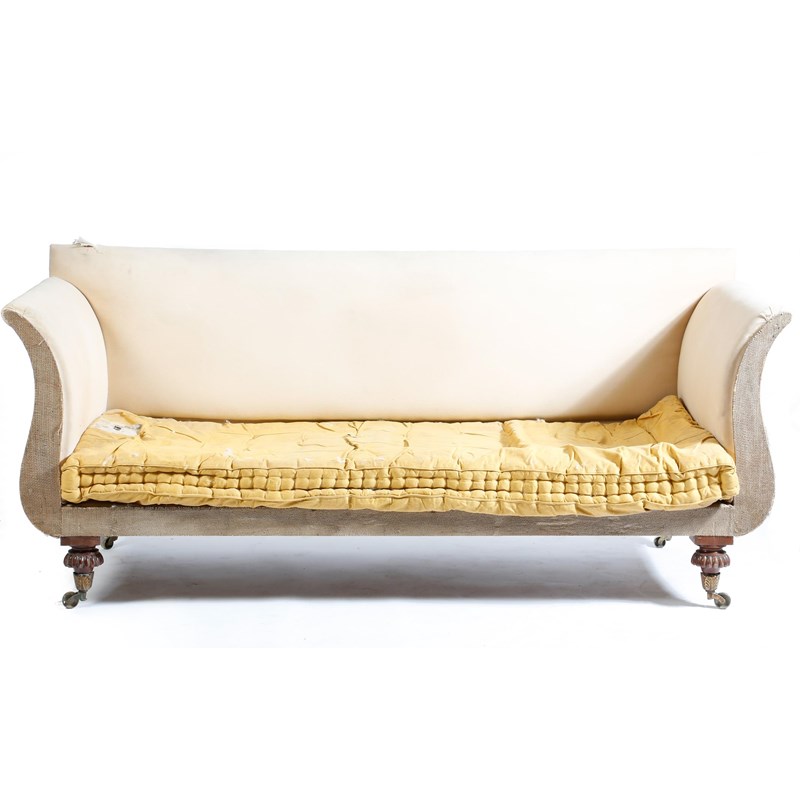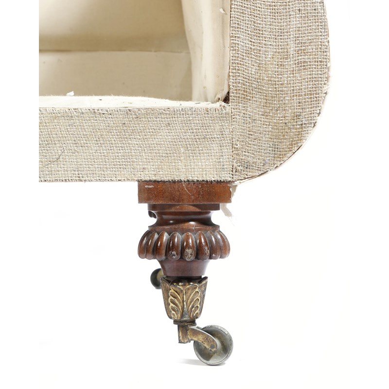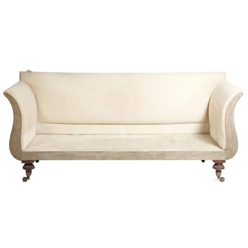 A scroll end sofa of country house proportions, on mahogany ribbed mushroom feet and leaf cast brass caps and castors, 93.5cm high, 216cm wide, 80.5cm deep.