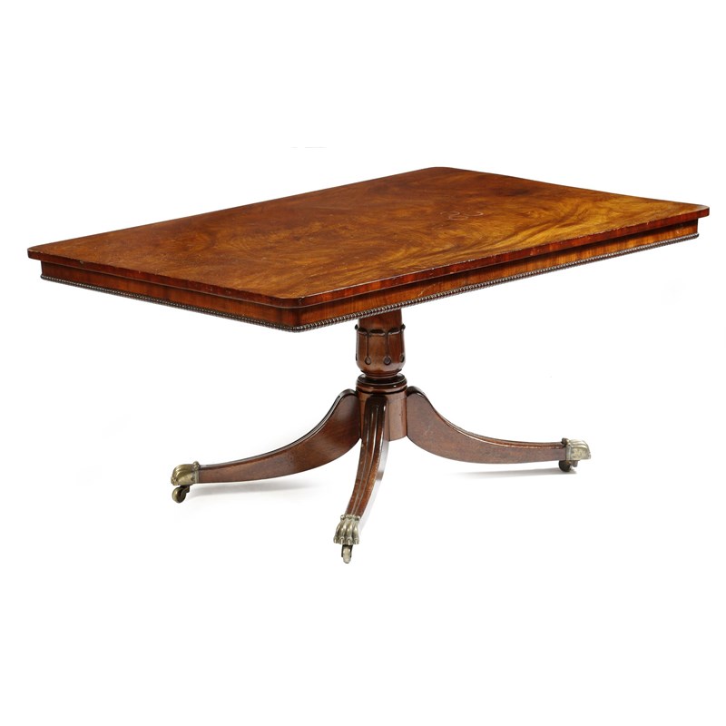 A George IV mahogany breakfast table, the rectangular tilt-top with a nulled edge, on a lappet carved stem, on four splay legs and stylised lion's paw sabot and castors, 71cm high, 98 x 145.5cm.