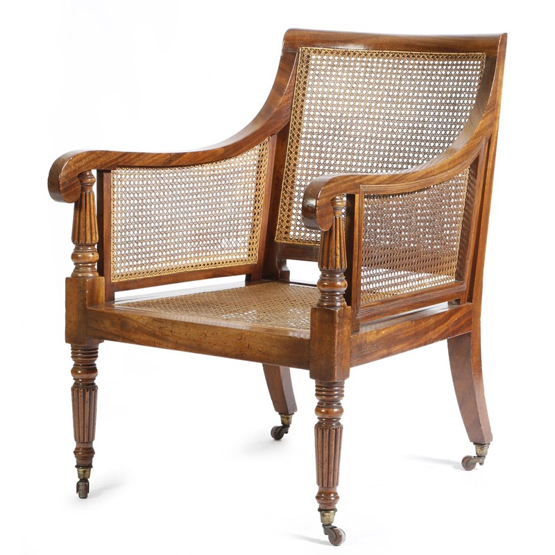 A George IV mahogany bergère armchair in the manner of Gillows, with a cane back, sides and seat, with ribbed arm supports and front legs, on later ceramic castors.
