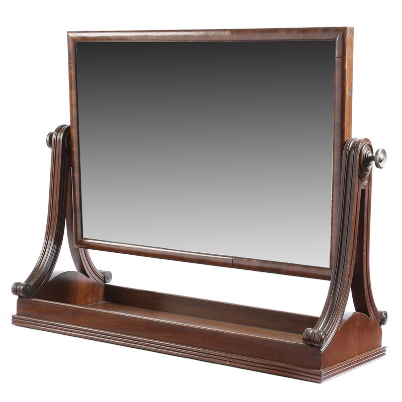 A George IV mahogany toilet mirror in the manner of Gillows, with a rectangular plate and fluted scroll supports and a rectangular tray base with a reeded edge, 53cm high, 66cm wide, 25.7cm deep.