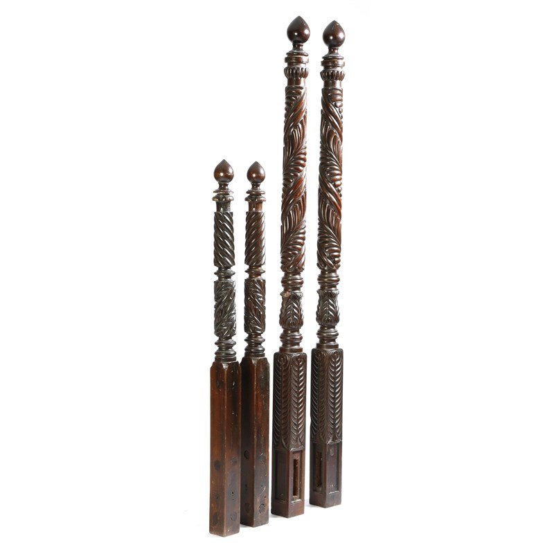 A pair of William IV mahogany bedposts in the manner of Gillows, the stem carved with palm fronds above acanthus leaves, the rectangular base with stylised leaf designs, with later finials, together with a similar smaller pair, 201.5cm high (max). (4)