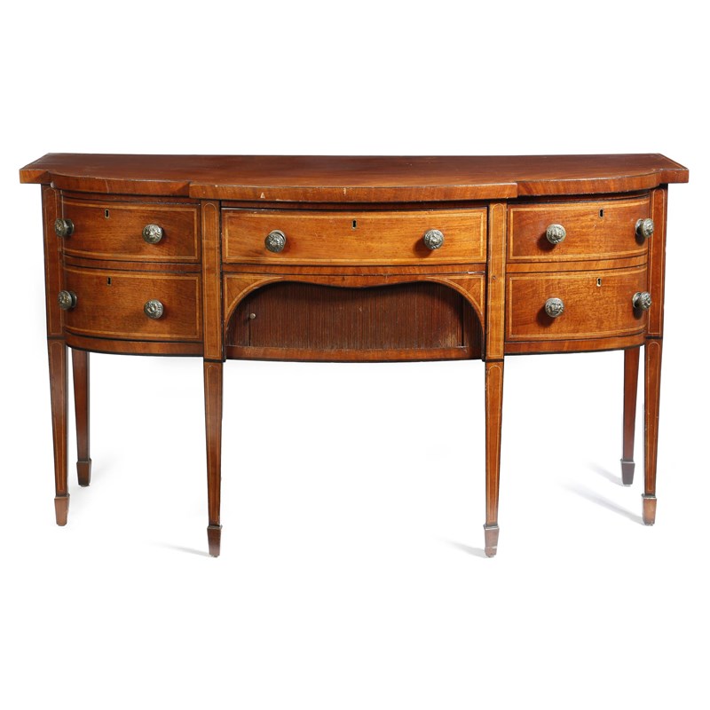 A Regency mahogany breakfront sideboard, inlaid with kingwood banding and ebonised and boxwood stringing, fitted with three drawers, a deep cellaret drawer and a tambour shutter, 95.8cm high, 168.7cm wide, 70.5cm deep.