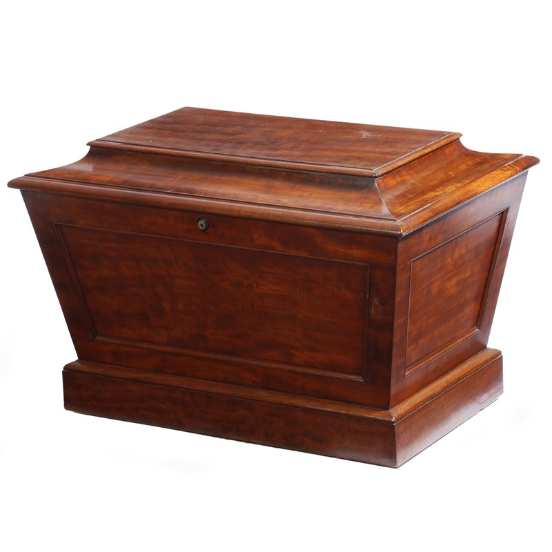 A George IV mahogany wine cooler, of sarcophagus shape, the interior with a later lining and with a brass Brahma lock, on castors, 52cm high, 77cm wide, 50cm deep.