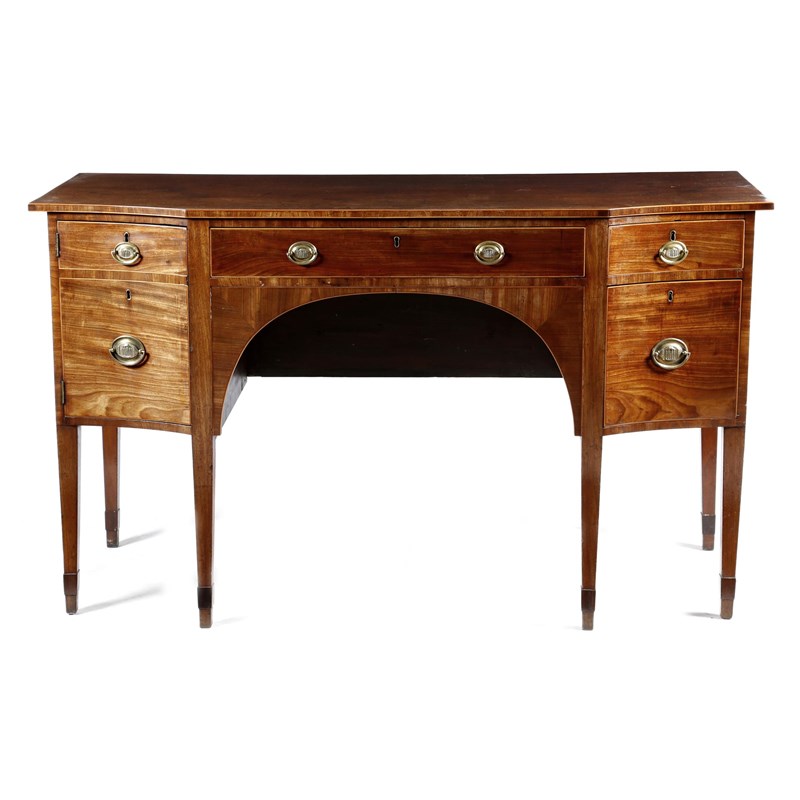 A Regency mahogany sideboard, inlaid with boxwood stringing, with a central frieze drawer flanked by a concave drawer, a deep bottle drawer and a cupboard, on square tapering legs and applied ankles, 97.8cm high, 166.1cm wide, 65.8cm deep.