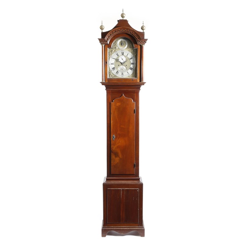 A late George III mahogany longcase clock by John Price of Chichester, the eight day movement with an anchor escapement and five turned pillars striking on a bell, the twelve inch brass arched dial with Roman and Arabic numerals to the silvered dial, with subsidiary seconds and date dials, inscribed 'John Price Chichester', with four season spandrels and Strike/Silent dial to the arch, with a pagoda top hood and a Gothic ogee trunk door, 227.5cm high.