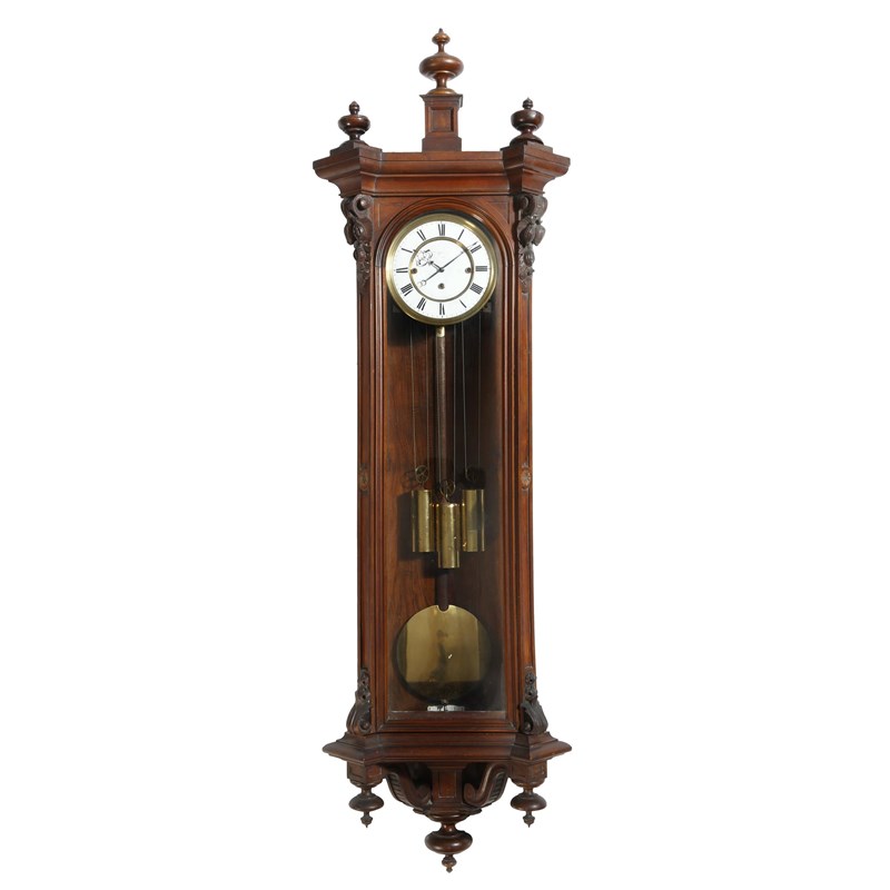 A 19th century Austrian walnut Vienna regulator, the eight day three train grande sonnerie brass movement striking on two bells, with an anchor escapement, the enamel dial with Roman numerals, blued steel hands and indistinctly signed to the recessed centre, in a typical case, with turned finials and carved applied corbels, 140cm high.