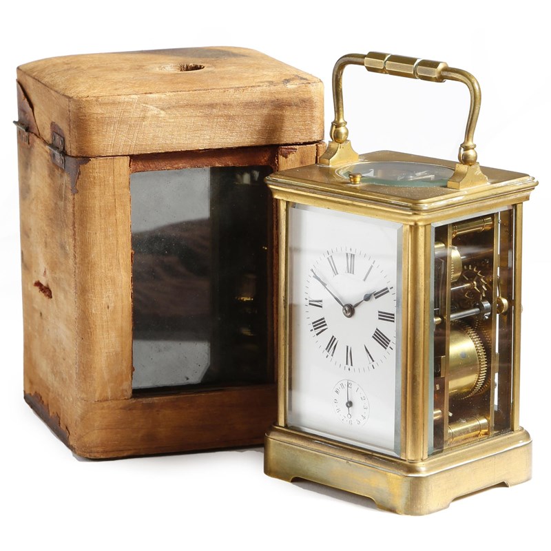 A late 19th century French brass repeating carriage clock, the twin barrel movement with a platform lever escapement, striking on a gong, the backplate stamped 'PATENT SJRETY POLLER', the white enamel dial with Roman numerals and subsidiary alarm dial, in a brass corniche case, with travelling case. (2)