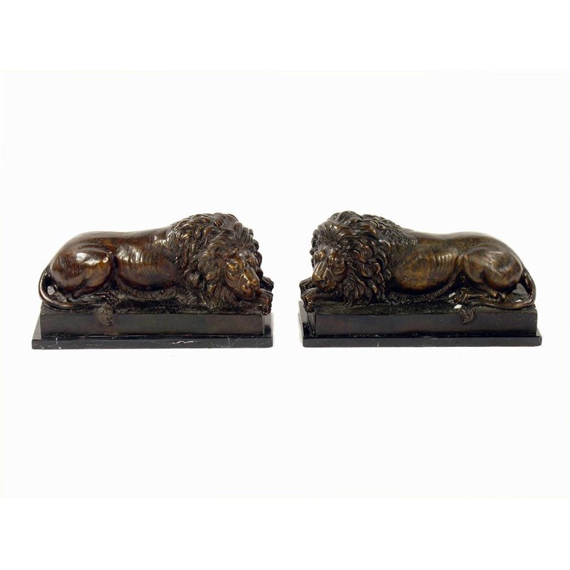 A pair of bronze models of recumbent lions