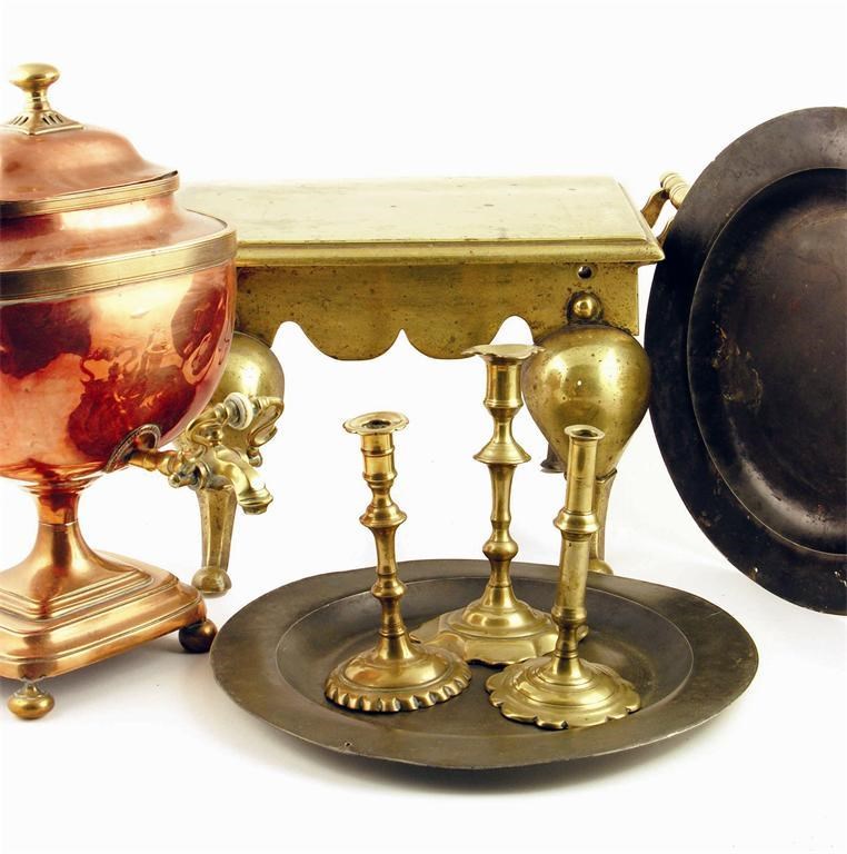 A 19th century brass footman, 10.75in (27cm) h, a Victorian copper tea urn with brass tap, three 18th century brass candlesticks and a pair of pewter chargers, 15in (38cm) dia. (7)