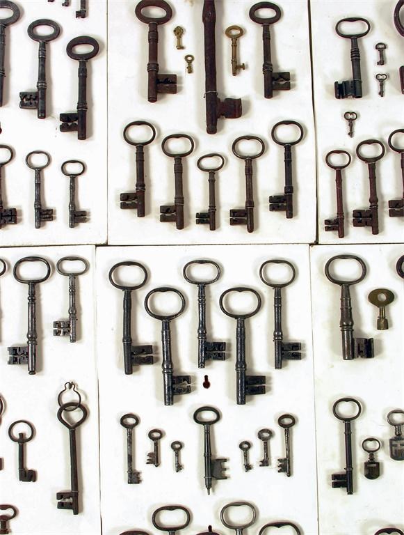 A collection of keys mounted on seven rectangular panels. (Approximately 120)