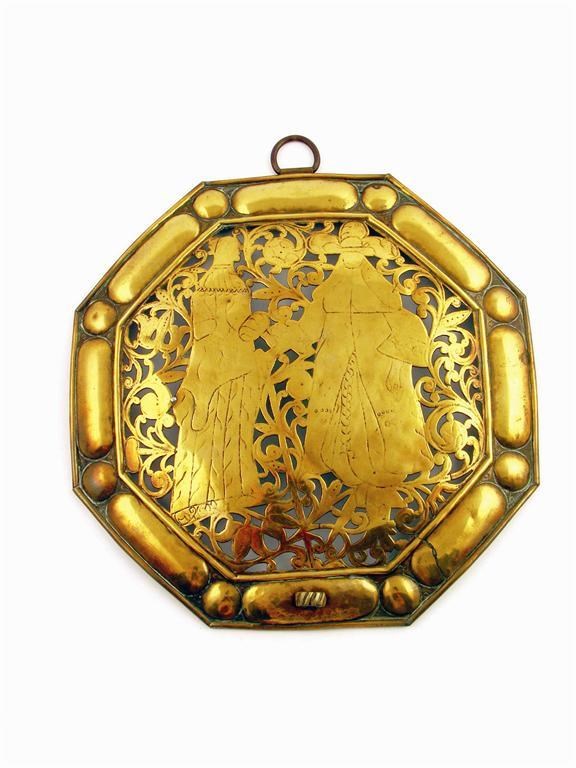 A Dutch pierced and engraved brass octagonal wall sconce back plate, arms missing, decorated a female and male figure in period costume, probably early 18th century, 10.25in (26cm) w.