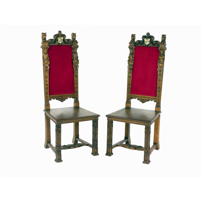 A pair of French carved oak side chairs, the rectangular backs with relief carved shaped crests centred a painted armorial with knights helmet above flanked by masks and terms, the seat on conforming square legs united by an H stretcher. (2)
