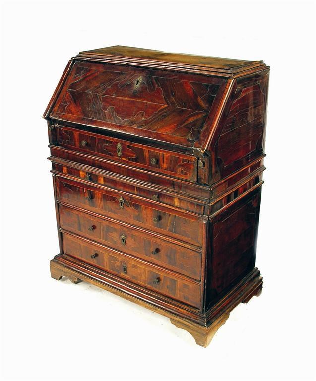An 18th century Italian walnut small bureau, inlaid stringing with cedar banding, the stepped quartered top above a hinged fall revealing three drawers and pigeon holes to a frieze drawer flanked by lopers, to girdle mouldings and a shallow slide above three long drawers, fitted replaced brass knob handles on later bracket feet and modern Shepherd castors, 38.5in (98cm) h, 32in (81cm) w, 17.5in (44.5cm) d.