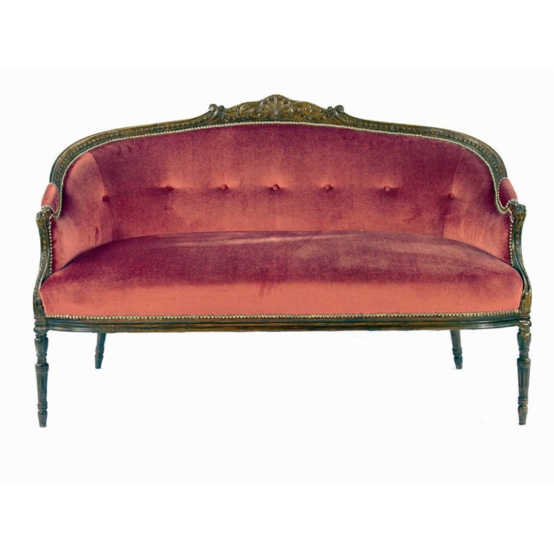 A late 19th century carved beechwood frame settee, the shaped back centred a palmette to foliage and husk decoration, later upholstered with brass studding, the bow front seats on vase turned and stiff leaf legs, restoration, 36.25in (92cm) h, 57in (144.5cm) w, 30in (76cm) d.