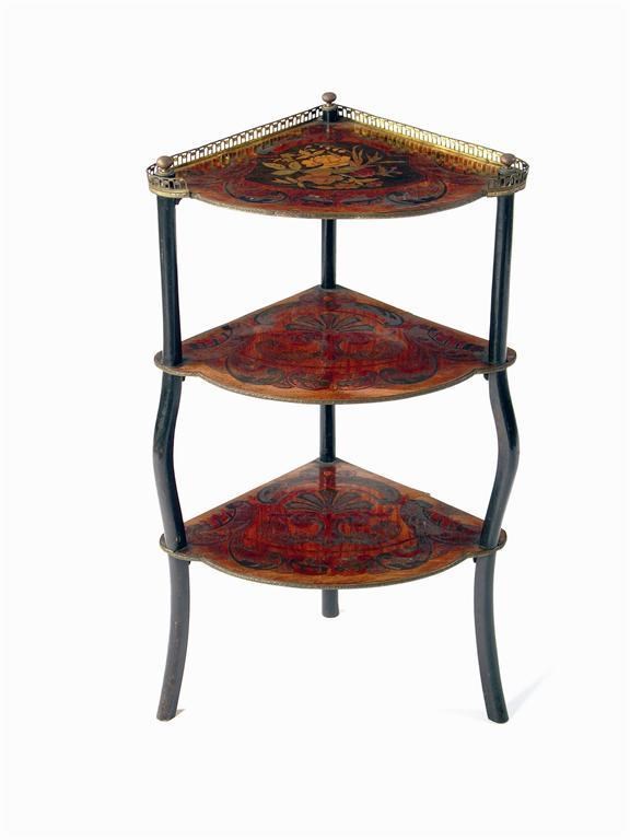 A late 19th century French marquetry inlaid corner three tier etagere, with gilt brass mounts on ebonised supports, 30.5in (77cm) h, 18in (46cm) w.