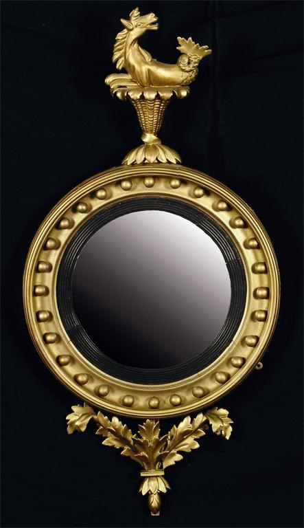 A 19th century giltwood and gesso convex mirror, later painted, with a hippocampi surmount and leafage and bud base, 36.5 x 18in (92.5 x 46cm).