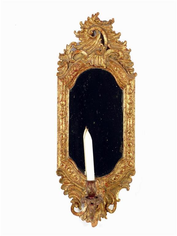 A carved giltwood and gesso girandole, with a shaped and bevelled plate to pierced rocaille decoration, the base with a single arm, 25.25in (64cm) h, 9.5in (24cm) d.