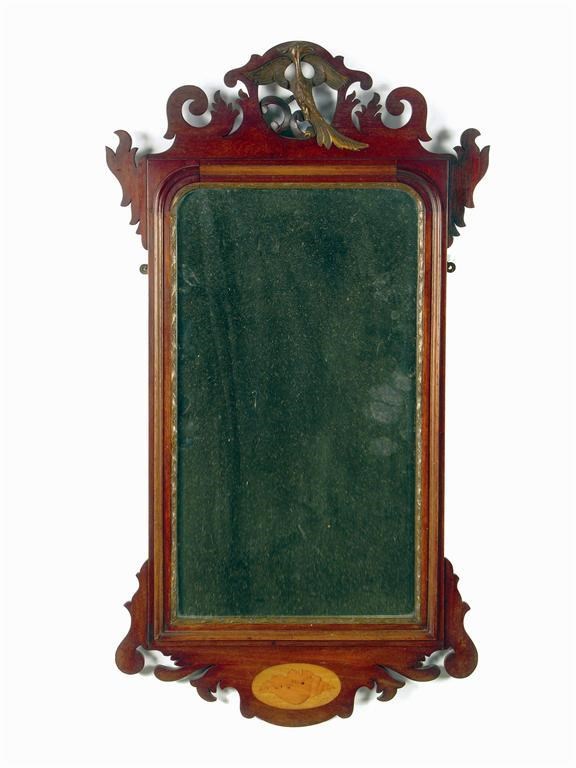 A mahogany fret frame wall mirror, with a rectangular plate and arched top the cresting pierced a ho-ho bird, the base inlaid a marquetry shell, 36 x 20in (91.5 x 51cm). Early 20th century