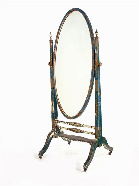 A chinoiserie decorated cheval mirror, the oval bevelled edge to a blue ground with gilt and red decoration on ceramic castors, c.1920, decoration worn, 69.25in (176cm) h, 26.5in (67cm) w, 24.5in (62) d.