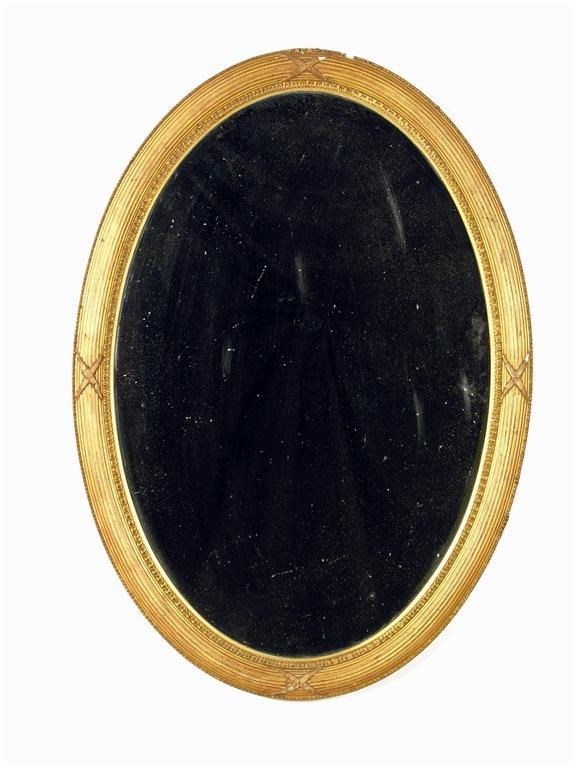 An Edwardian giltwood and gesso oval wall mirror, the bevelled plates with a tied luted frame, 24 x 34in (61 x 86.5cm).
