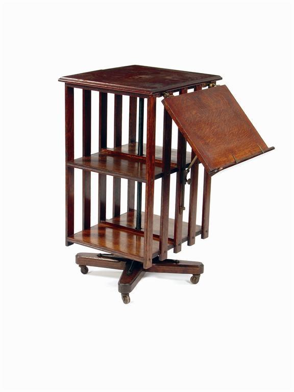 An oak revolving bookcase, with a hinged reading slope, on wooden casters, 36.5in (92.5cm) h, 21.25in (54cm) w.