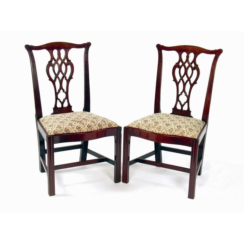 A pair of George III mahogany side chairs, with pierced vase shape splats and drop-in serpentine front seats to square moulded chamfered legs united by an H stretcher. (2)