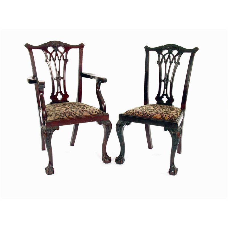 A set of eight mahogany Chippendale style dining chairs, with leaf carved and pierced splats, with drop in seats comprising of a pair of open armchairs and six side. (8)