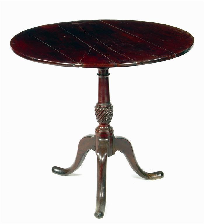 A late George III mahogany tripod table, the circular tilt top repaired, on a spiral ribbed turned stem on three faceted legs, 29in (73.5cm) h, 32.75in (83cm) dia.