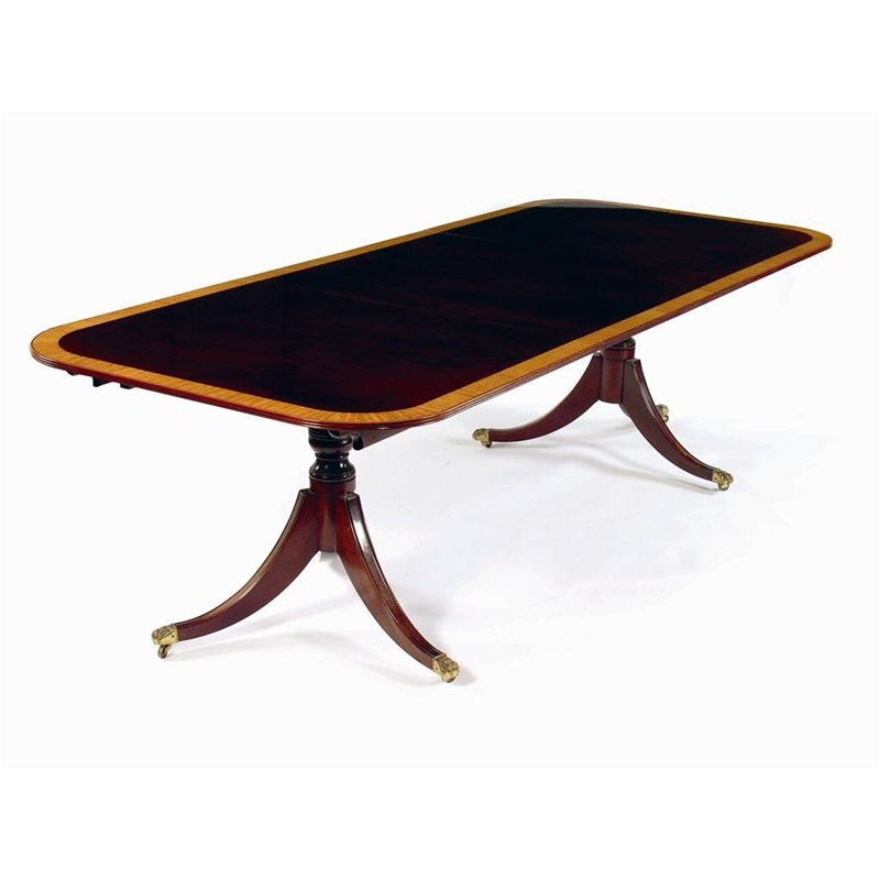 A Regency style mahogany twin pedestal dining table, by Corlyon, the satinwood banded top with two extra leaves, and a reeded edge, 29.5in (74.5cm) high, 106.5in (270cm) extended, 44in (112cm) w.