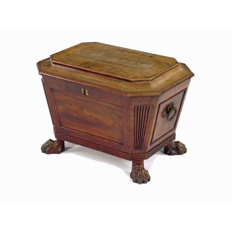 A George IV mahogany sarcophagus wine cooler, the cross banded sloping top above panelled side and a plain back with ribbed angles to a reed edge on carved paw feet, one damaged, previously on castors, the interior previously lined, with bung, 17.25in (44cm) h, 25.25in (64cm) w, 18in (45.5cm) d.