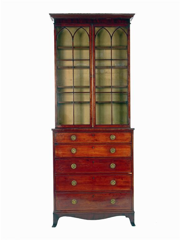 An early 19th century mahogany secretaire bookcase, of narrow proportions, the pair of astragal glazed doors with ebonized stringing enclosing adjustable shelves, the base with a hinged fall revealing pigeon holes, drawers and a separate writing slope, above three long drawers fitted later circular pierced brass plate handles on splay bracket feet, back left missing, 92in (233.5cm) h, 38in (96.5cm) w, 14.5in (37cm) d. Old restoration.